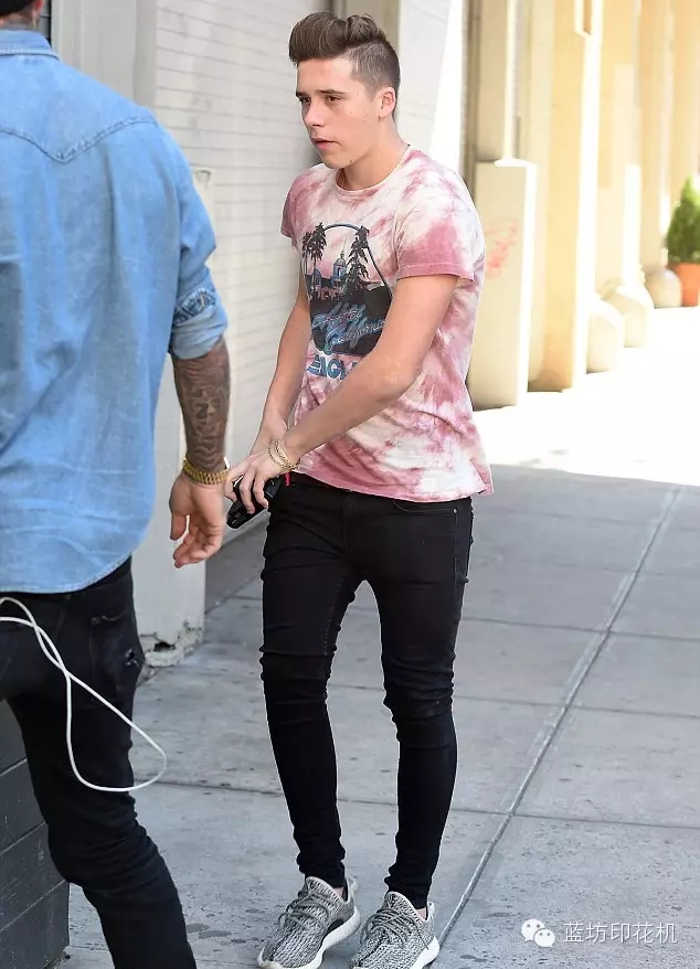 布鲁克林穿了一件扎染的T恤,黑色牛仔裤,一双坎耶·维斯特设计的阿迪达斯运动鞋