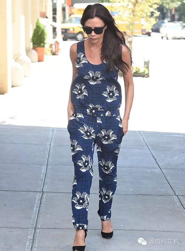 时尚一家子的辣妹穿了一件无袖的蓝色印花上衣,裤子和上衣的面料一模一样